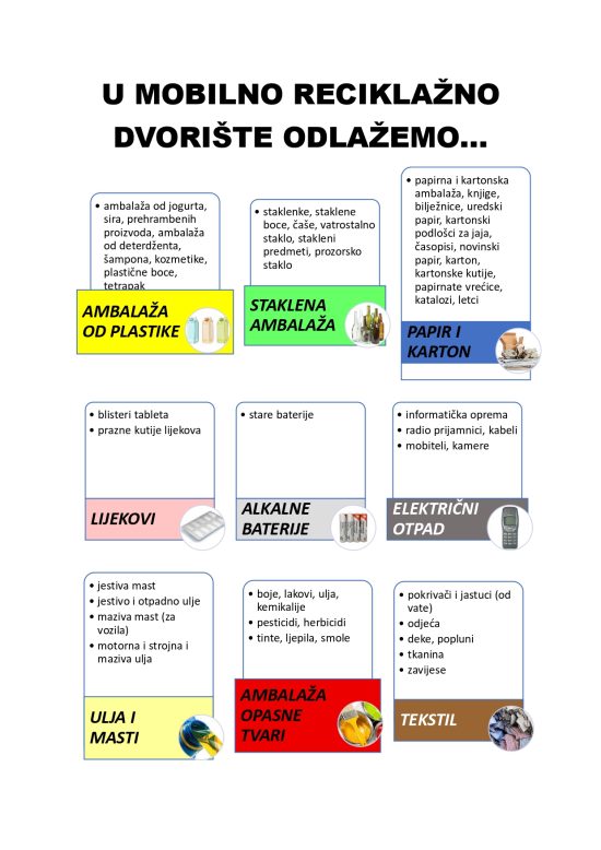 Mobilna reciklažna dvorišta su pokretne jedinice koje služe odvojenom prikupljanju i skladištenju manjih količina posebnih vrsta otpada iz kućanstva. U mobilno reciklažno dvorište u skladu sa terminima koji su objavljeni dolje niže, mogu se odložiti sljedeće vrste otpada: